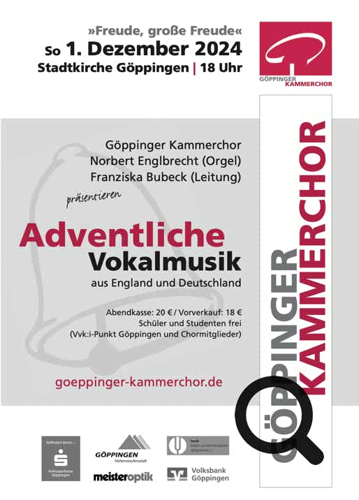 Am Abend des 1. Advent lud der Göppinger Kammerchor zu einem festlichen Chorkonzert in die Stadtkirche Göppingen ein. Unter der Leitung seiner neuen Dirigentin Franziska Bubeck präsentierte der Kammerchor adventliche und weihnachtliche a-cappella-Musik aus England und Deutschland. An der Orgel begleitet wurde der Chor von Norbert Englbrecht, dem neuen Dekanatskirchenmusiker von St. Maria.