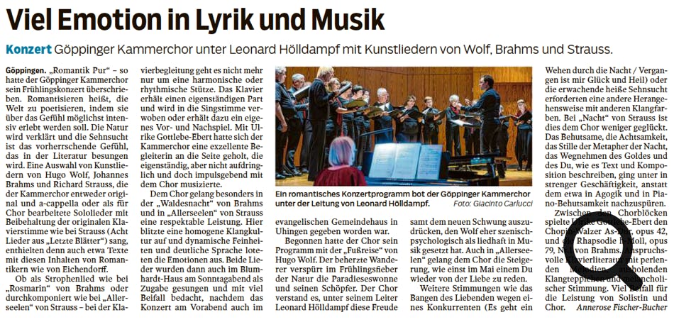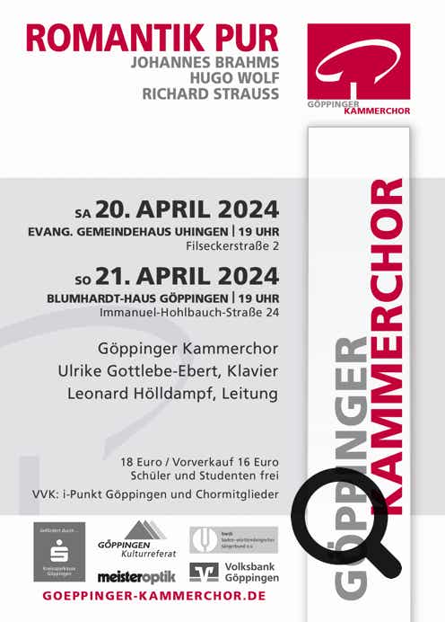 Unter Leitung von Leonard Hölldampf singt der Göppinger Kammerchor Sieben Lieder (Opus 62) von Johannes Brahms, Acht Lieder (Opus 10) von Richard Strauss begleitet von Ulrike Gottlebe-Ebert am Klavier und die Sechs Geistlichen Lieder von Hugo Wolf.