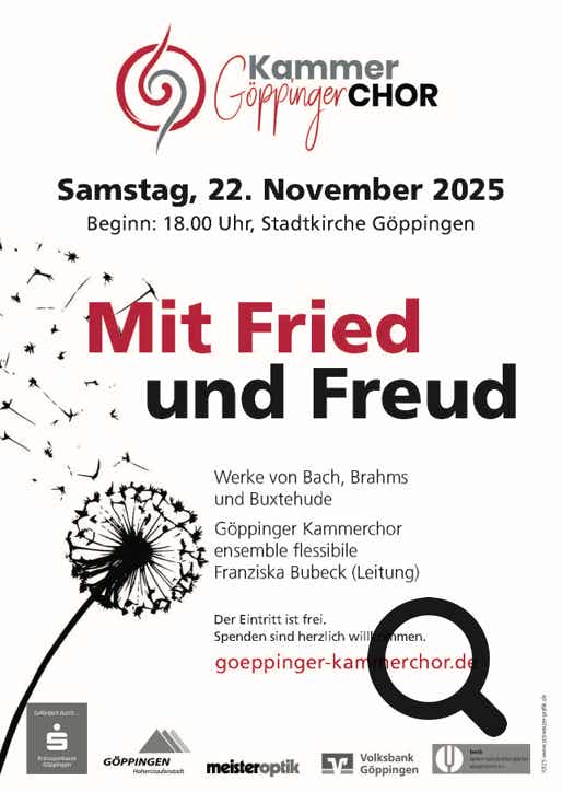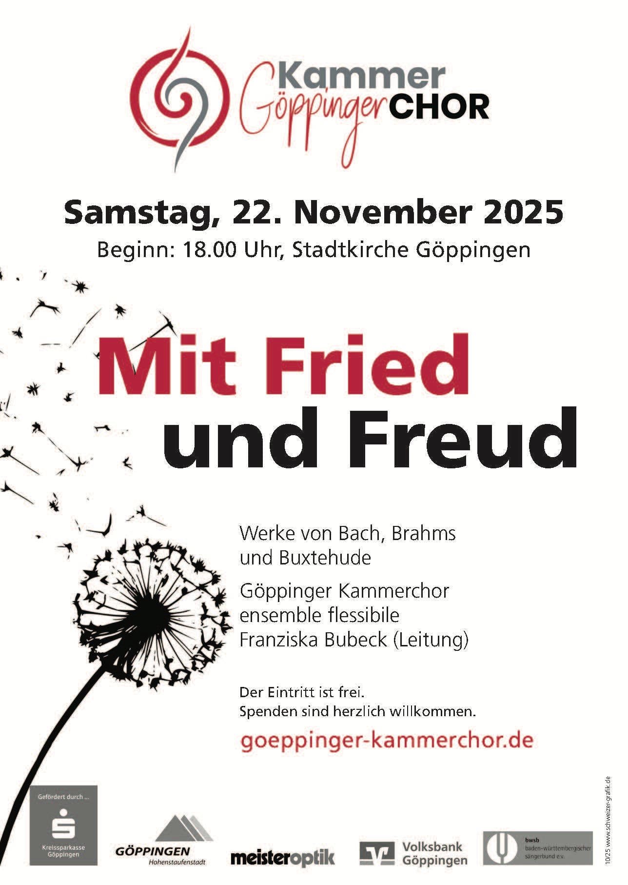 Unter dem Titel „Mit Fried und Freud“ widmet sich der Göppinger Kammerchor Musik, die solchen Fragen nachspürt. Werke von Johann Sebastian Bach, Dietrich Buxtehude und Johannes Brahms bilden dabei den roten Faden durch ein Programm, das den Weg von der Erkenntnis der Sterblichkeit über die Trauer bis zur Zuversicht nachzeichnet.