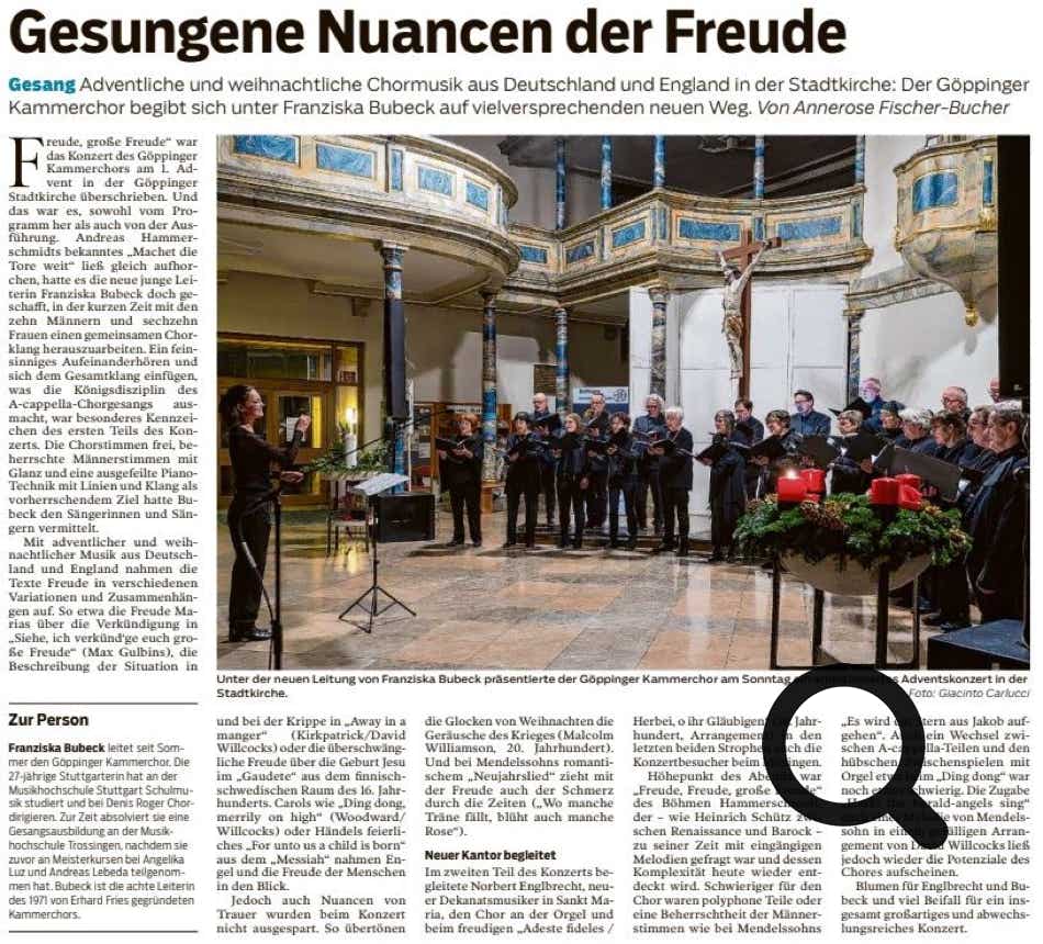 Am Abend des 1. Advent lud der Göppinger Kammerchor zu einem festlichen Chorkonzert in die Stadtkirche Göppingen ein. Unter der Leitung seiner neuen Dirigentin Franziska Bubeck präsentierte der Kammerchor adventliche und weihnachtliche a-cappella-Musik aus England und Deutschland. An der Orgel begleitet wurde der Chor von Norbert Englbrecht, dem neuen Dekanatskirchenmusiker von St. Maria.